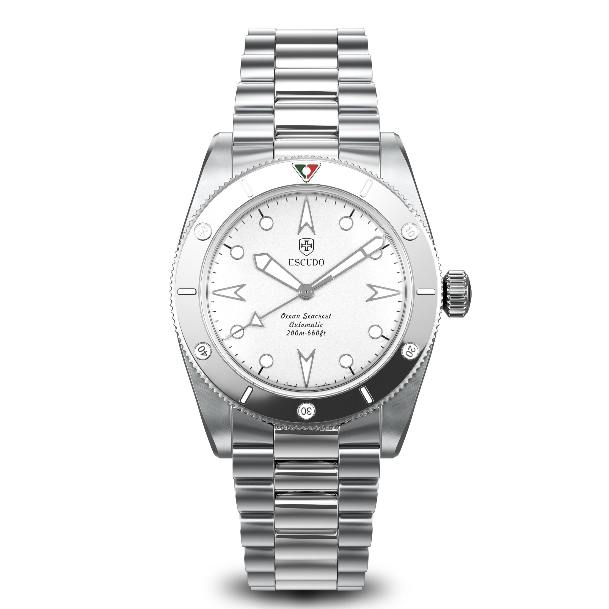 Simple tapered silver hands for excellent visibility and designed to integrate perfectly with the time indicies and fully lumed for clear underwater vision.